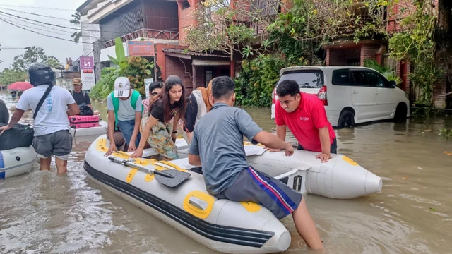 Canggu, Bali – Hujan deras yang mengguyur wilayah Badung dan sekitarnya kembali menimbulkan bencana banjir di kawasan Canggu dan Berawa. Peristiwa ini membuat ratusan warga dan wisatawan asing panik karena air yang tiba-tiba meluap hingga setinggi pinggang. Lebih parahnya lagi, evakuasi terpaksa dilakukan dengan peralatan seadanya, bahkan menggunakan ban mobil bekas untuk menyeberangkan wisatawan yang terjebak.