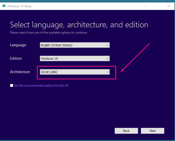 5. Pada tampilan selanjtnya anda akn diarahkan kepada tampilan selanjutnya akan tampil informasi Windows 10 yang akan kita download, hilangkan centang pada Use the Recommended option this PC, dengan demikian anda dapat mengubah Architecture windows 10, anda bisa memilih windows 10 32 bit atau yang 64 bit. silahkan pilih sesuai dengan kebutuhan anda. disini saya memilih yang 46bit. kemudian klik Next.