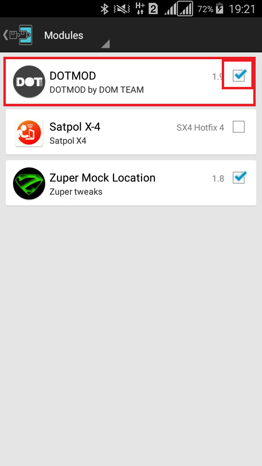 Kemudian Langkah Selanjutnya Reboot HP kamu kemudian buka kembali xposed lalu aktifkan module, dengan cara klike module – centang pada module DOTMOT, perhatikan gambar dibawah.