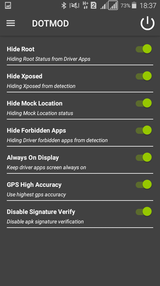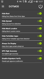 setelah DOTMOD telah aktif pada Xposed langkah selanjutnya adalah seting DOTMOD fungsinya adalah untuk menyembunyikan status Root dan Peniruan Lokasi palsu, untuk seting DOTMOD , caranya buka DOTMOD kemudian Perhatikan Gambar Dibawah ini.