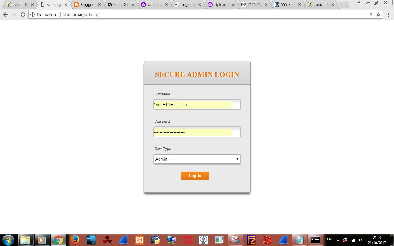 1. sekarang kita search ke google menggunakan dork yg diatas ane kasih gan, klo udh ketemu pilih          salah satu website , nah klo udh pilih salah satu website sekarang kita coba masukkan username dan password dengan kode inject diatas tuh udh ane kasih >:( , lihat gambar