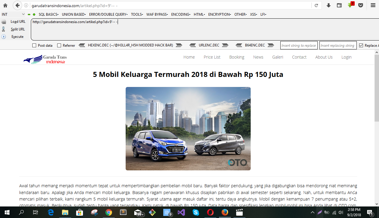 http://garudatransindonesia.com/artikel.php?id=9’+ORDER+BY+2– – = NO ERROR/ BLANK
