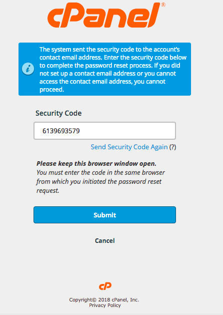 8. Cek Email yang anda masukan untuk mengambil Security Code cpanelnya, jika sudah ada  langsung masukan dan Klik tombol Submit.